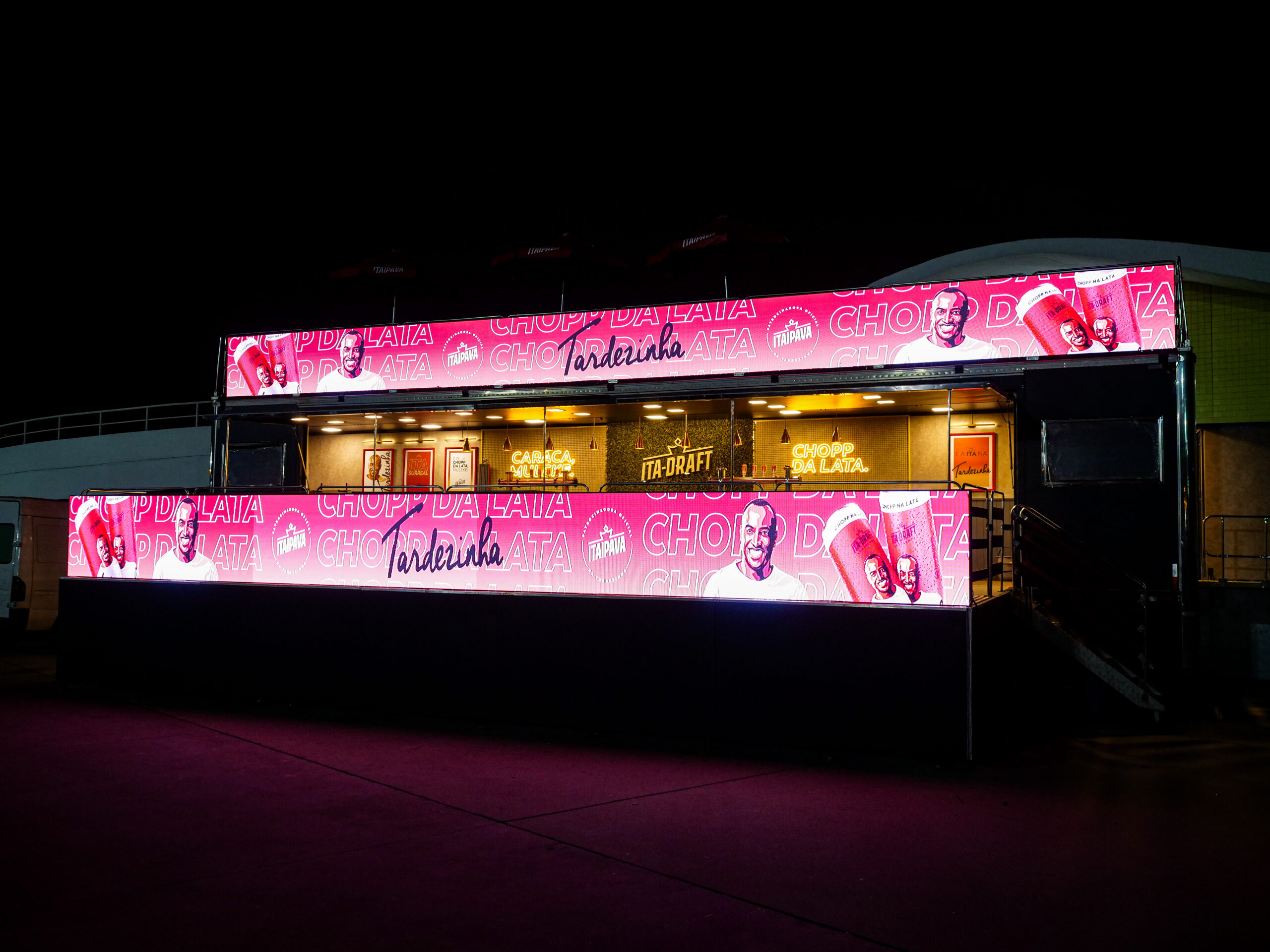 Painéis de led foram instalados no mezanino e no deck superior, possibilitando a personalização de conteúdos da marca de acordo com cada evento. São mais de 25 metros de painéis, que fazem com que a carreta seja vista de longe.