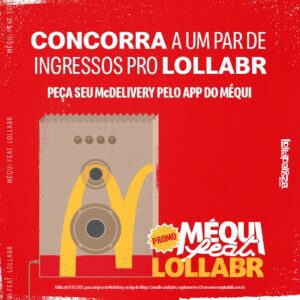 Baixou o app do Méqui, pediu McDelivery, cadastrou e concorreu! O McDonald’s chega em seu segundo ano de Lollapalooza Brasil com ainda mais fome de festival e vai levar McLovers para curtir um dia de shows inesquecíveis com a promoção Méqui no Lolla 2023!